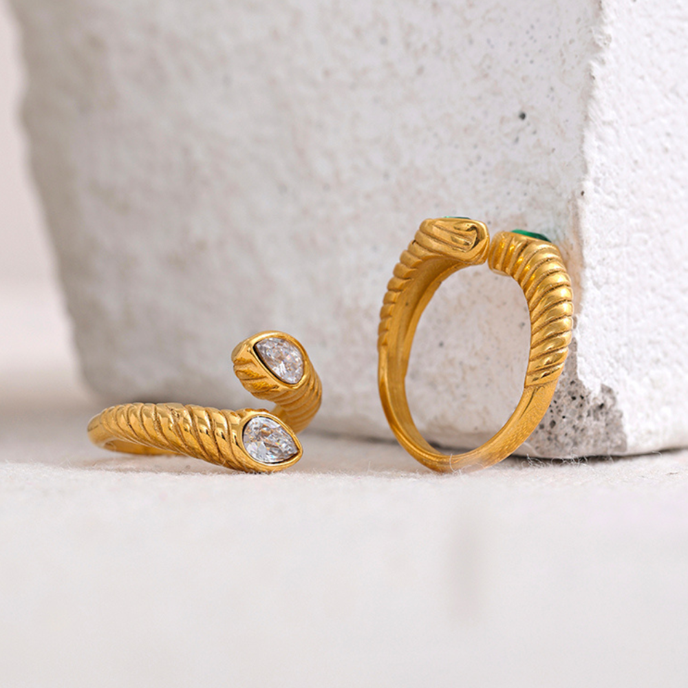 Cette bague Gaea est une pièce unique en son genre, dorée à l'or fin et est ornée de deux pierres en zircone en forme de goutte d'eau qui ornent ses extrémités. Le design est simple et élégant, et la bague est recouverte d'un éclat doré qui reflète la lumière. La bague a une signification profonde puisqu'elle est nommée d'après la déesse grecque Gaea, qui symbolise la terre et la féminité.