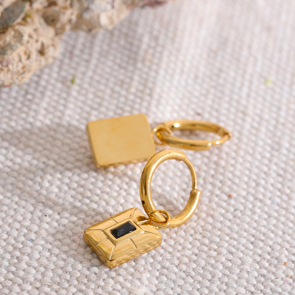 Les Boucles d'oreilles Enyo sont des bijoux dorés à l'or fin qui se caractérisent par leur forme réctangulaire. Elles sont ornées d'une pierre en zircon au centre, disponible en noir ou cristal. Ces boucles d'oreilles sont nommées d'après Ényo, la déesse de la guerre et du carnage dans la mythologie grecque. Elles sont le parfait accessoire pour ajouter une touche d'éclat et de sophistication à votre look.