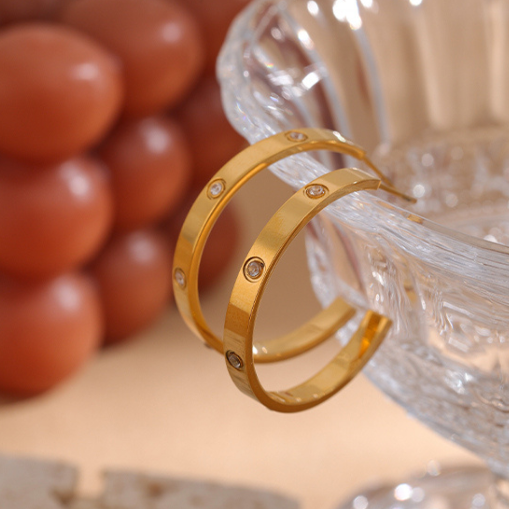 Les Boucles D'oreilles Hestia sont des créoles dorées à l'or fin avec une forme classique et intemporelle. Elles sont ornées de petites pierres précieuses zircones qui ajoutent une touche de brillance à la fois subtile et luxueuse. Les créoles sont assez discrètes pour être portées quotidiennement et représentent le nom de la déesse grecque Hestia de la mythologie grecque. Ces boucles d'oreilles sont une pièce classique qui complète n'importe quel look et sont superbes portées de jour comme de nuit.