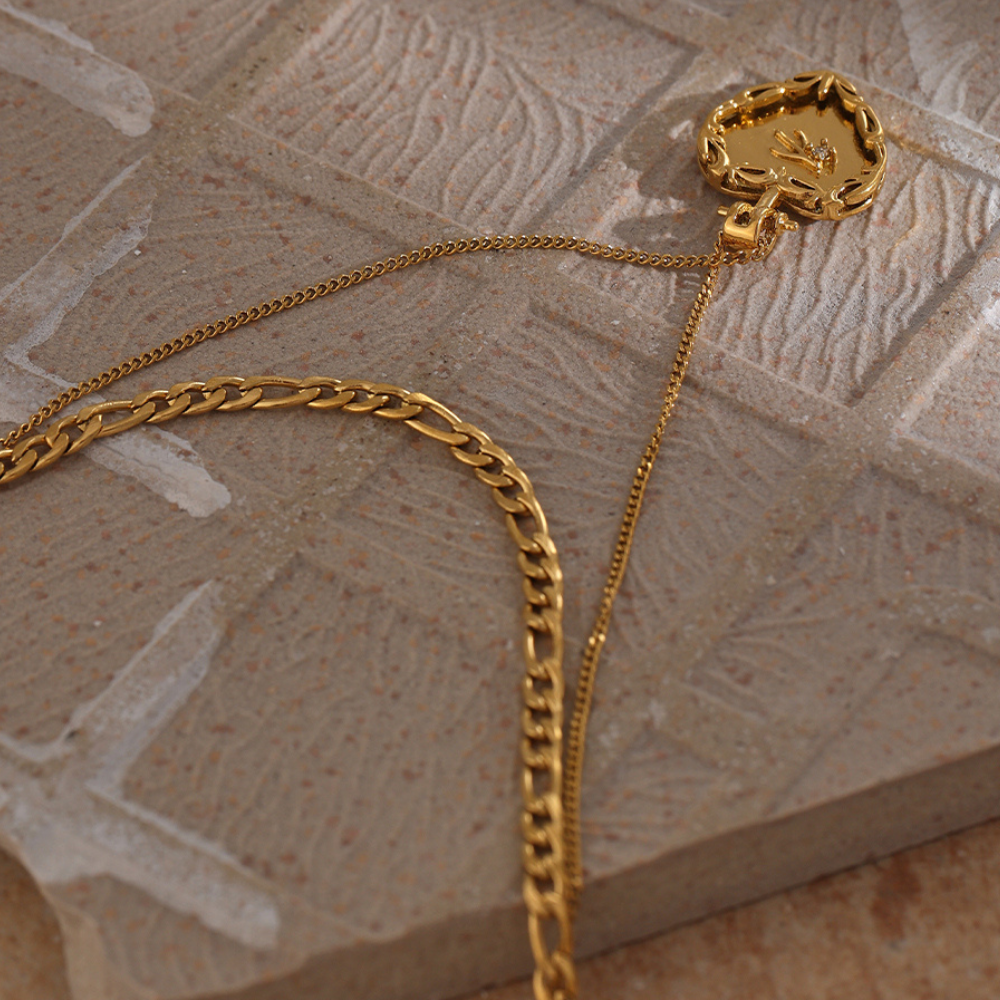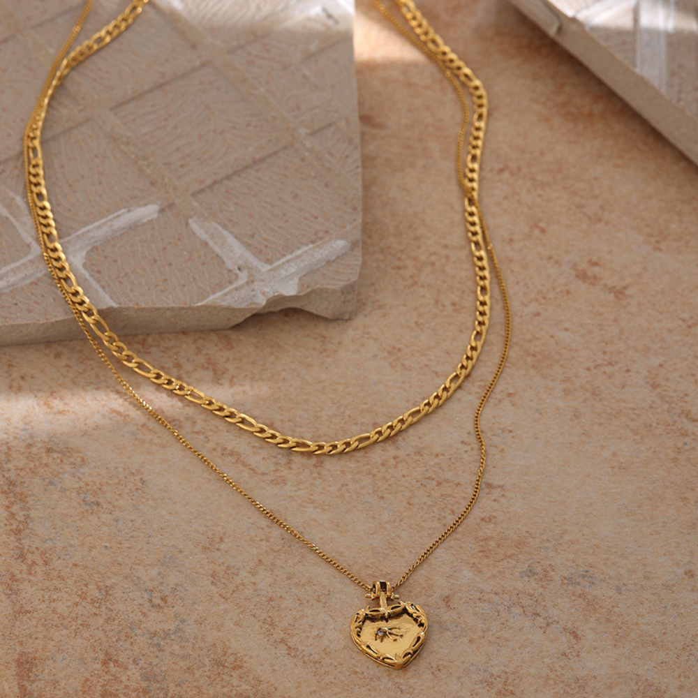 Ce collier ravissant est doré à l'or fin. Il est composé d'une double chaîne dorée qui se termine par un pendentif en forme de coeur, inspiré de la grèce antique. Le pendentif est orné de petits détails gravés à l'extérieur. Le collier est si léger et discret qu'il peut être porté tous les jours. Il ajoutera une touche d'élégance à n'importe quelle tenue.