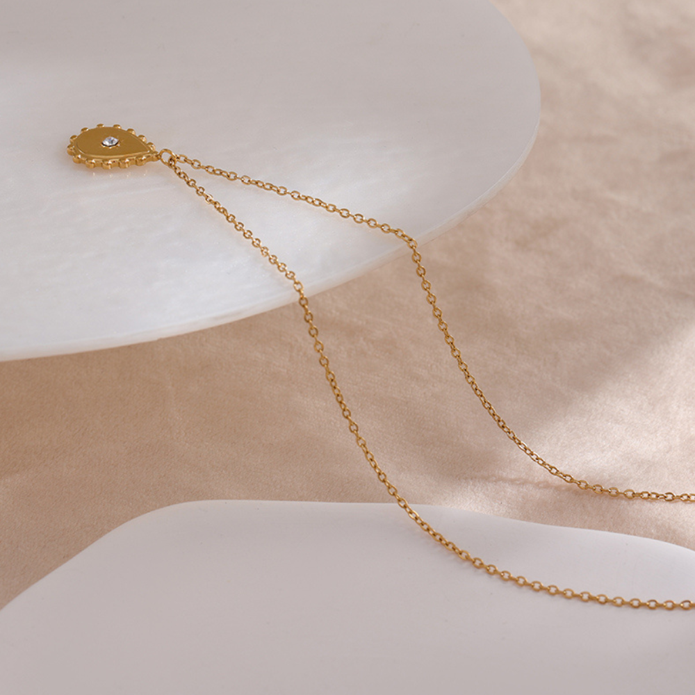 Ce collier doré à l'or fin est magnifique. Il est orné d'un pendentif en forme de goutte d'eau, avec un motif de soleil au centre et un zircone étincelant qui brille de mille feux. Le collier est fin avec des détails délicats et un design élégant. Ce collier est parfait pour compléter une tenue élégante et est certain d'attirer l'attention.