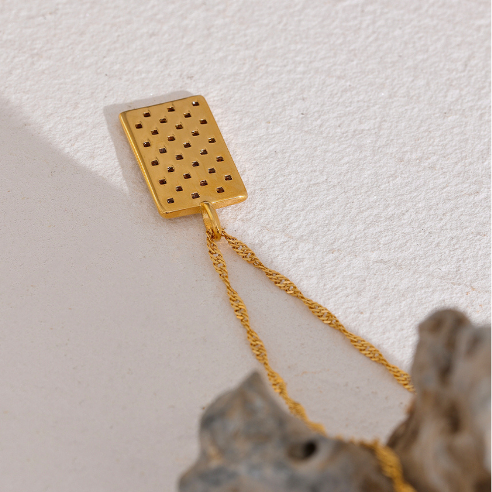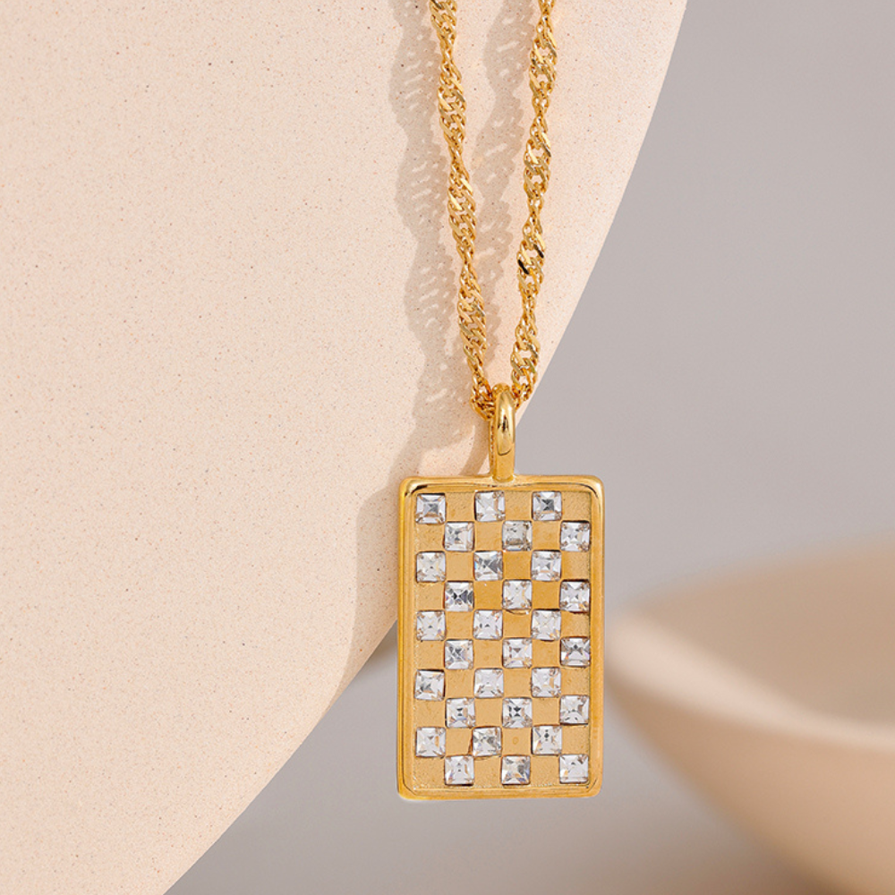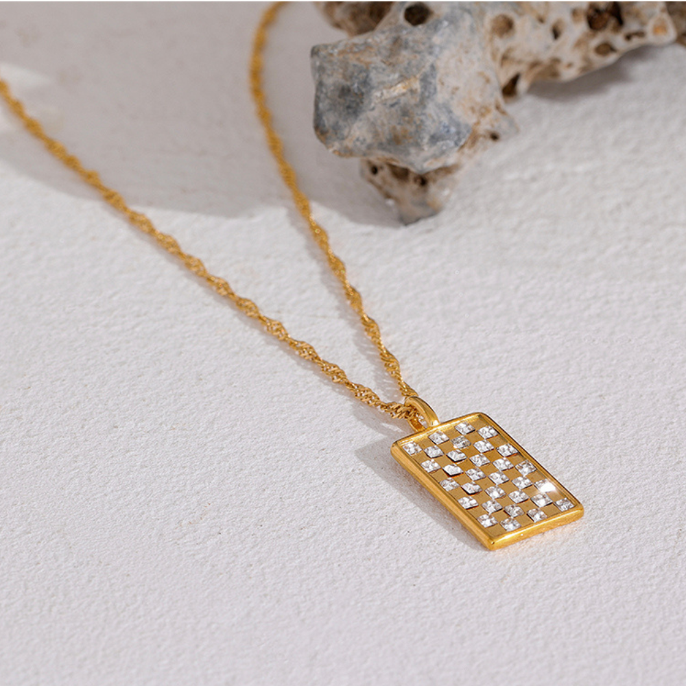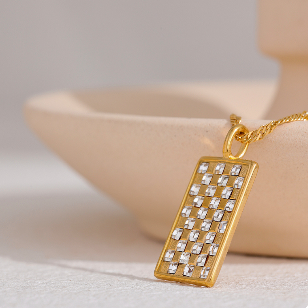 Le collier doré à l'or fin est composé d'un pendentif de forme rectangulaire qui est orné de plusieurs zircons carrés du nom de Furies. Les zircons sont de couleur blanche et scintillent magnifiquement. Le pendentif est serti sur un élégant cordon en or. Le collier est un accessoire parfait pour compléter n'importe quelle tenue et ajouter une touche de glamour supplémentaire.