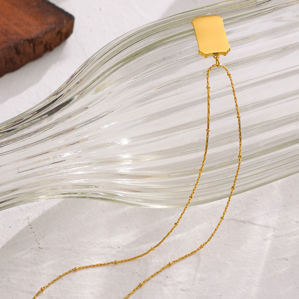 Ce collier est doré à l'or fin et a une chaîne fine et délicate. Il comporte un pendentif rectangulaire avec des formes solaires à la surface. La chaîne est attachée à un mousqueton qui se ferme pour s'ajuster à la taille du cou. Ce collier est à la fois élégant et intemporel.