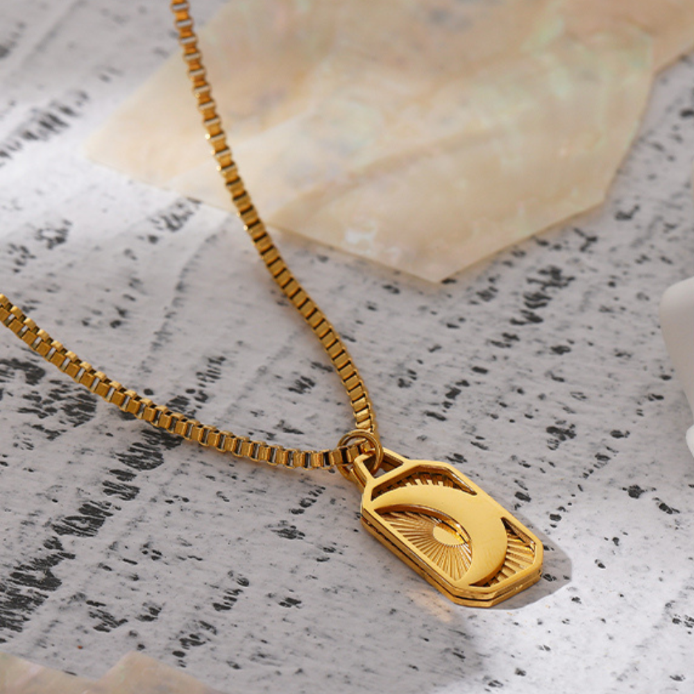 Ce magnifique collier doré à l'or fin est orné d'un pendentif en forme rectangulaire et d'une demi lune. Inspiré de la culture grecque antique, ce collier est une pièce délicate et intemporelle. La couleur dorée est luxueuse et le pendentif est serti de motifs faisant briller le collier. La chaîne est dotée d'un fermoir sécurisé. Une pièce somptueuse qui fera merveille à tous les coups.