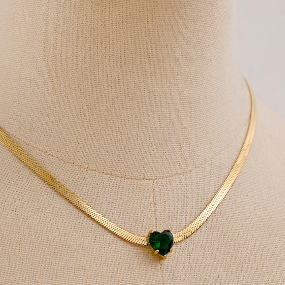 Le Collier Perséphone est un magnifique bijou doré à l'or fin, richement orné d'un zircon en forme de coeur. Disponible en trois teintes scintillantes - cristal, vert et rose -, ce luxueux collier est à la fois élégant et intemporel. Sa finition précise et sa belle luminescence en font un accessoire chic que vous pouvez porter avec tous vos looks.