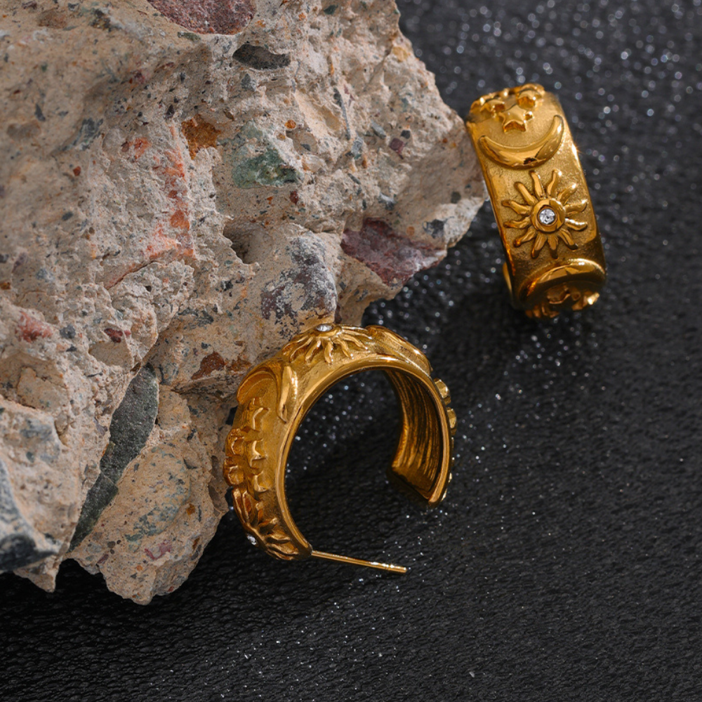 Les boucles d'oreilles créoles dorées à l'or fin de la déesse grecque Séléné sont des bijoux élégants et raffinés. Elles sont faites d'une base circulaire en or fin et ornées d'un design à la fois simple et sophistiqué. La partie extérieure de la boucle est ornée de deux formes de lune et de soleil, qui font référence à la déesse grecque Séléné, . Ces boucles d'oreilles sont parfaites pour les soirées spéciales et les occasions formelles, offrant une touche de glamour à tout style de tenue.
